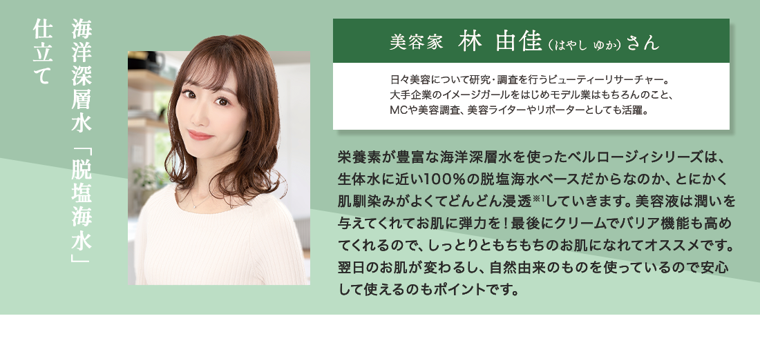 今から40億年前、生命が誕生した場所、それは海でした。私達の体液と海水のミネラル組成が驚くほど似ているという事実は、私達が海から生まれた事の証。生命=肌に最も適した海水に着目しました。海洋深層水は、化学物質などの汚染がなく、植物性プランクトンの生育に必要な栄養素が豊富で、微量元素やミネラルがバランスよく溶け込んでいるため、”キレイを育む美容水”と言えるのです。