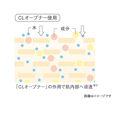 「イントローション」内の「CLオープナー」分子がお肌に触れると、一時的に弱酸性のバリア機能がゆるまり、水分や美容成分が浸透※2しやすい状態に。アルカリ温泉が美肌の湯と言われるのは、これと同様の作用があるからです。